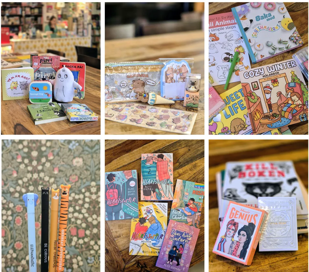 Utöver litteraturen finns bok- och pappersrelaterade presentartiklar som anteckningsblock, pennor, bokmärken, pysselböcker, klistermärken samt merch från bland annat Studio Ghibli, Harry Potter, Stranger Things och många fler.